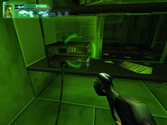 在三楼的房间,从屏幕上可以看到a,b两组密码,c组可能应为机器故障无法看到,转到里面的控制台可以拿到密码的资料(一个盒子,有点象硬盘)。里面一个房间需要放上两个电池,上面房间是看密码房间,现在先不管。