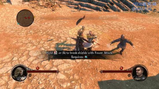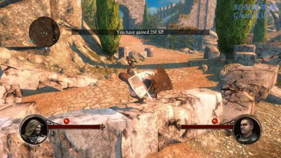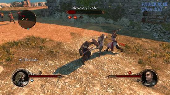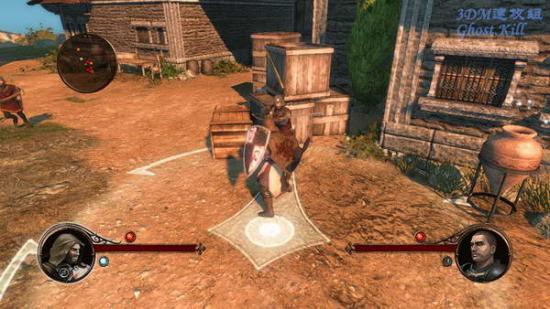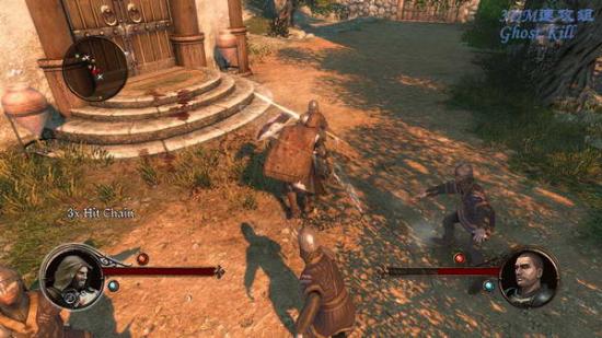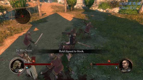 接下来上去一个上坡后会遇到弓箭手,被攻击前主角脚下会显示准星,准星慢慢缩小,缩到最小的时候说明敌人该放箭了,按shift加方向键可以快速翻滚,先滚到弓箭手那解决掉后再杀掉其他敌人。