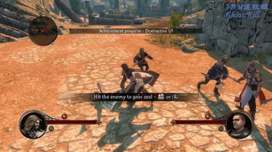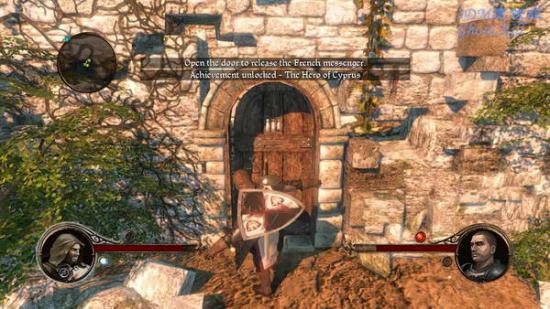 杀光敌人后从山坡下去,左边的房子着火了,可以去救人,也可以不去。从山坡下去之后可以看到两个敌人在面前跑过,追上去,其中一个敌人是拿盾牌的,按住左键蓄力攻击可以砍烂盾牌,前提是血条下的蓝色球里有能量。
