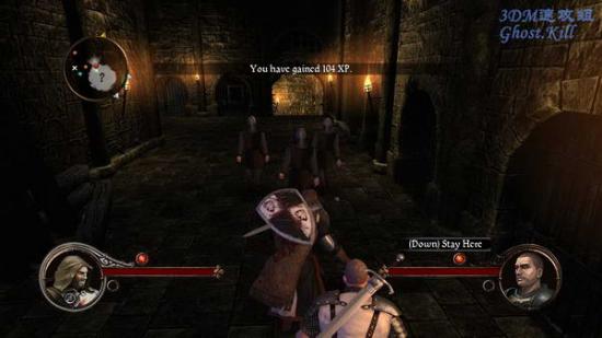 下层是监狱,按住shift在背后偷偷接近两个守卫,按左键一人一个扭断他们的脖子继续前进,前方三个敌人在巡逻,等他们背对我们的时候过去一个个暗杀掉,然后继续下楼。