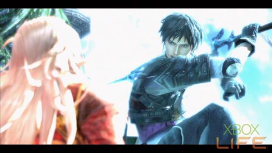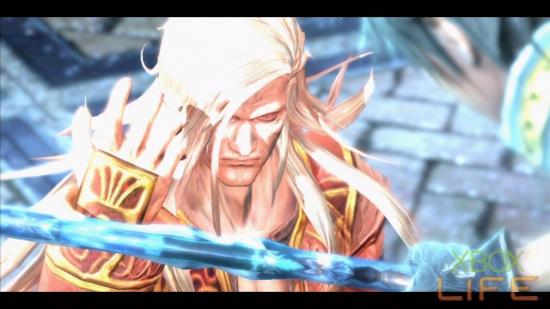 拉修突然整个人发出蓝光加速了起来,快速的穿过诺维亚斯、卡斯塔涅亚两人,冲过去给了霸王一剑,但是还是被霸王挡了下来打了回去。