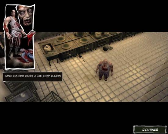 然后回到我们刚进来的地方,进入左边的门,来到食堂。这里非常空旷,在左边的小道尽头有一些弹药。右边的厨房会遇到游戏的第一个BOSS,一个变成丧尸的厨师。这里可以先站到门口,等BOSS走到灭火器旁边的时候射击灭火器,灭火器爆炸可以给BOSS造成非常大的伤害。干掉BOSS后从厨房后门出去。这是医生果断开枪干掉了主角受伤的伙伴。然后给震惊中的主角解释,被丧尸咬到的人是没救的。这样第二关结束。