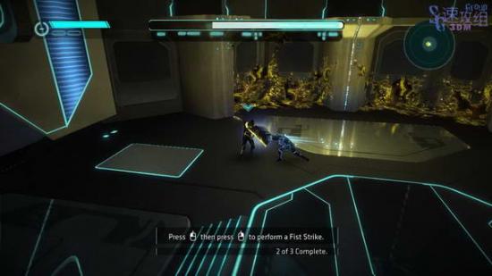 进屋后干掉屋里的敌人,出现新敌人,拿盾牌的,按crtl加F攻击,两次就可以破坏掉他的盾牌,前提是要有能量,房间里有补充能量的地方,按住shift跑到发光圆柱体那里就可以,补充过一次能量后需要过一段时间才能再次补充。破坏嗲盾牌后按照何一般小兵的打发干掉他就可以。
