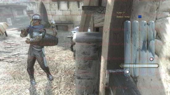 这里就算正式开始游戏了。在游戏里面的所有城镇,你都不是完全自由的。你在城镇进行任何的行为都可能引起警卫的警戒。如下图右上角的警戒条。红色槽一旦满,那么你就会被该区域的所有警卫疯狂群殴