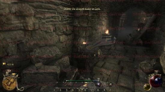 进入洞窟,一步一步搜刮吧。把这里么所有的箱子都打开,知道搜刮显示你找到所有的SCALES在回去。这里的敌人都是战斗力比较强的骷髅战士,而且战斗空间狭隘,使用魔法的话对付他们的话效果非相当的好