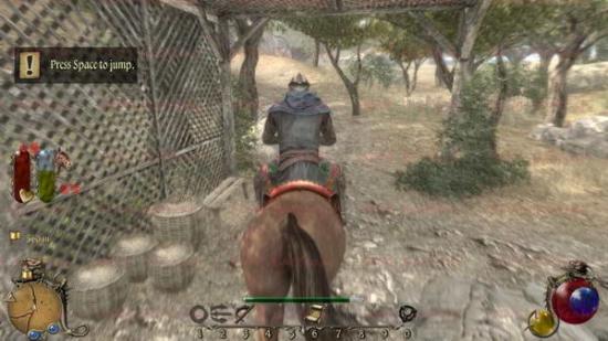 骑马行进的时候按SPACE则是跳跃。骑马停下来的时候按SPACE则是下马