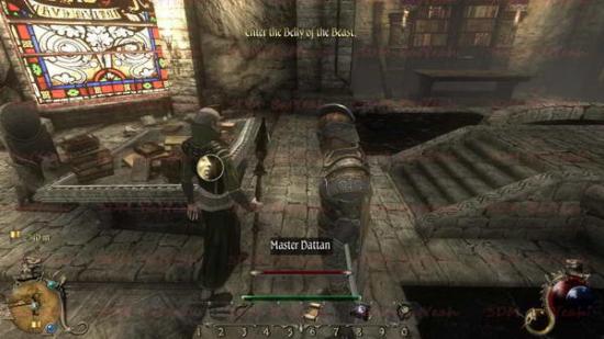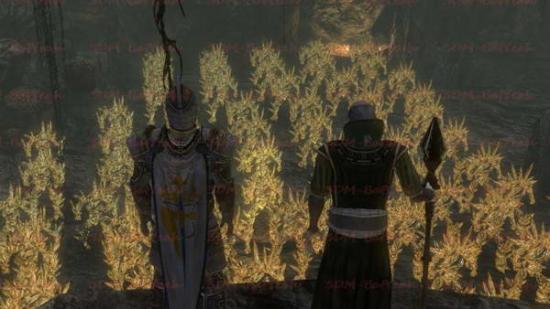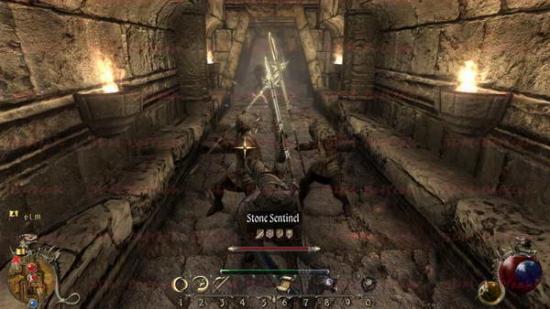 这里会出现一种新敌人。石制卫兵。这算是非常难对付的一个敌人。首先他对于物理攻击的防御非常的高,基本以你现在的武器根本打不动。而且这个敌人用的是双手长枪,非常容易来攻破你的防御姿态