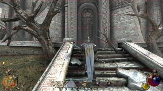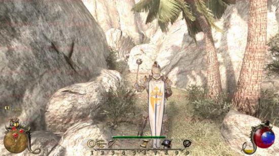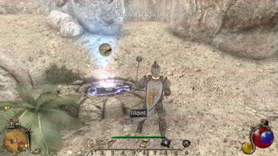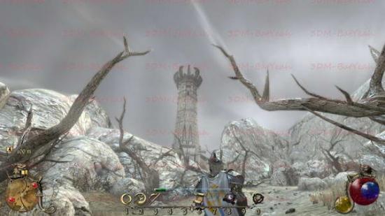 如下图。远处的高塔就是我们的目标点。魔法塔之外主要的敌人是巨蝎。而且大多都会主动来对你进行攻击。一路前进到魔法塔大门进入