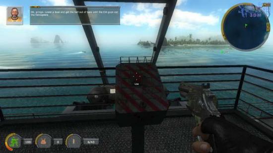 我们被带到了一艘船上,干掉一开始审问我们的家伙后在隔壁房间的柜子里找到自己的装备, 枪械还在,不过子弹不多了。船上很多特种兵,打的时候尽量打脸,头上有头盔,不好打。