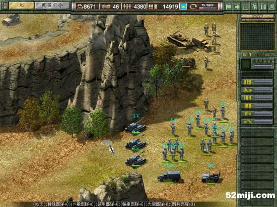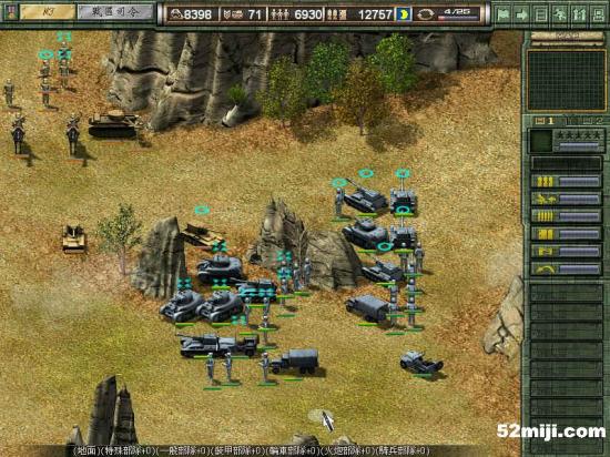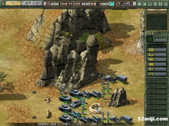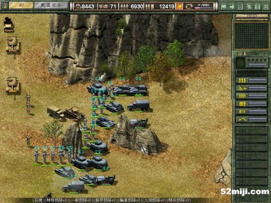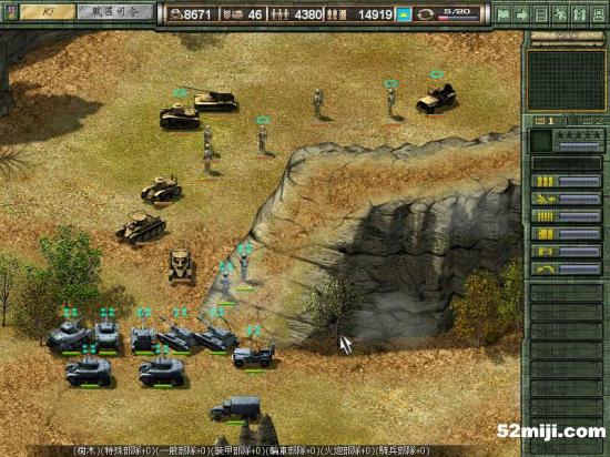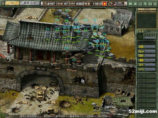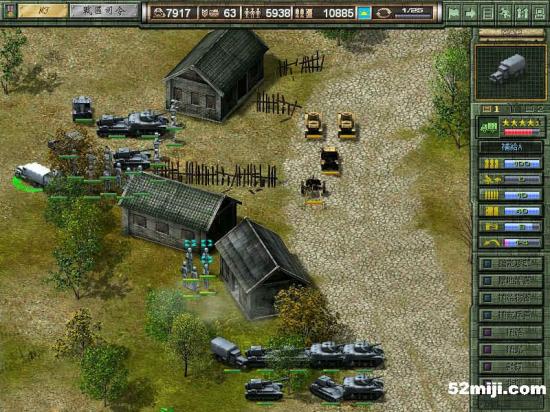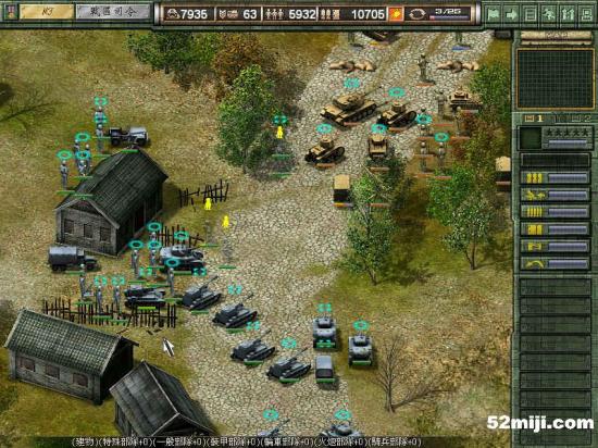 军队尽量布在左下,战车在前。一开始就加助攻,把2个铁丝网和上面的掩体打掉(一车一炮就够了),全军向左上前进。