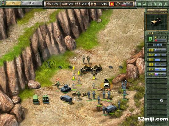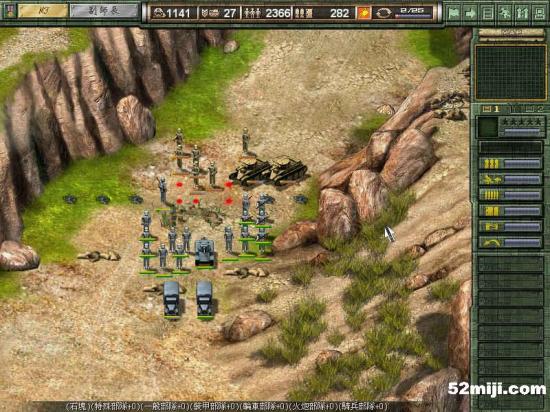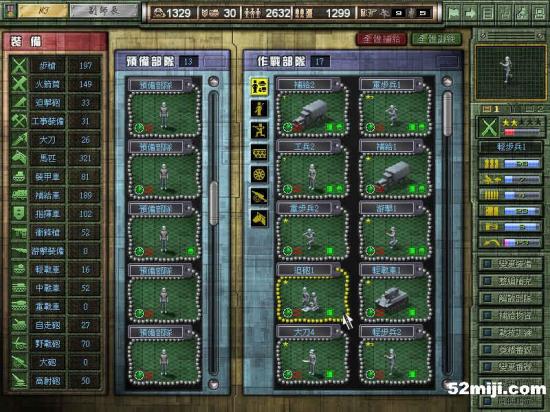 开始如图布阵:右边轻步兵在前,重步兵等在后,左边大刀隐藏好,注意远近火力结合。布雷以节省时间。第2合打掉中战车,第3合打掉运输队和指挥车(会自己冲上来)。然后硬拼剩下的步兵,6合内灭上面敌人,这部分约死50人。