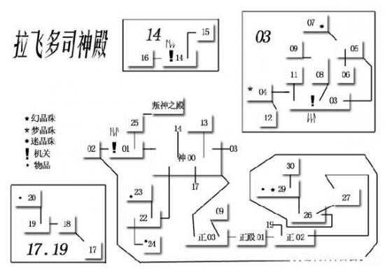 3.对于拉飞多司神殿我不想再多说什么了.这是一个超级大迷宫,我画它的地图整整用了一天!真是佩服风雷,把守护者之剑二的优良传统都带到圣女之歌里来了.建议玩家把三颗珠子找齐后就直奔叛神之殿.路上若遇到机关就回头找拉环,很多拉环都在上一个场景.