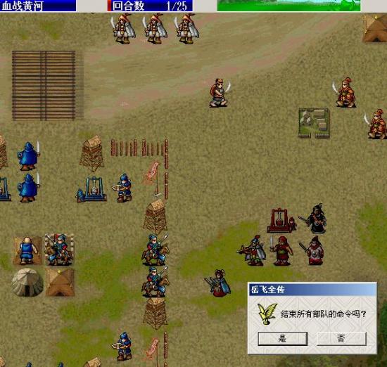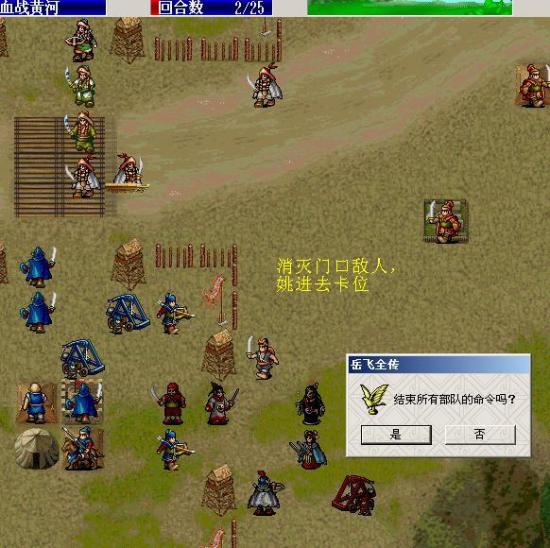 补充:由于各人级别不一样,可能会出现曹荣大营上角的炮兵下来档路,此时你需要移动施全到右上角的炮兵的炮口处,吉青和他并排,这样这门炮就会原地攻击,但要求施全升级为良医,可走 5步。如果前面没有升级,那么让于鹏移动到他的左下方给他吃印绶。)