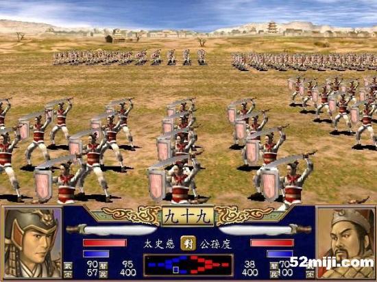 另外,本系列游戏的重头戏可以说是在壮观的两军对战厮杀场面,比前一代中,双方的带兵量又再次的加倍,达到了高达400人的上限,不仅数量增多,特别的是现在每位将军可以率领三种不同类的士兵来搭配,加上不同的阵形,就能产生许多战术的变化,例如:可以在前方布置武斗兵来作肉搏战,后方则是用长距离攻击的弓箭兵,这样长短攻击搭配起来士兵就会变很强。