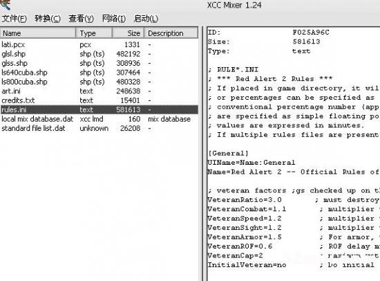红警游戏目录下有很多以mix为扩展名的文件,它们实际上是多个文件的集合,经过打包形成了一个文件(你可以把它想象成压缩文件)。红警游戏里面的许多游戏属性,都写在ini为扩展名的文件内,而ini文件就被藏在mix文件里。我们要修改游戏,就是把ini文件从mix文件中提取出来,经过对ini文件进行修改,以达到我们修改游戏的目的。