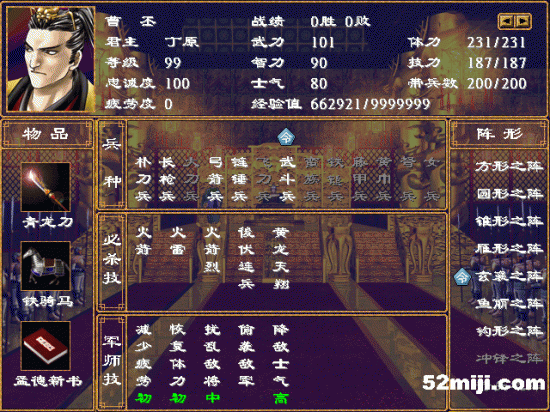 5、曹否武将技稍差,不过火箭烈+后伏连兵+黄龙天翔,也不错。而且他的武力不算太低,早期可以一用。等郭嘉出了狂雷天牢后,可以换上郭嘉。