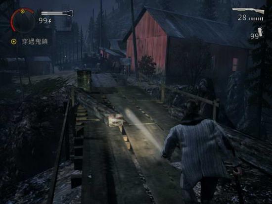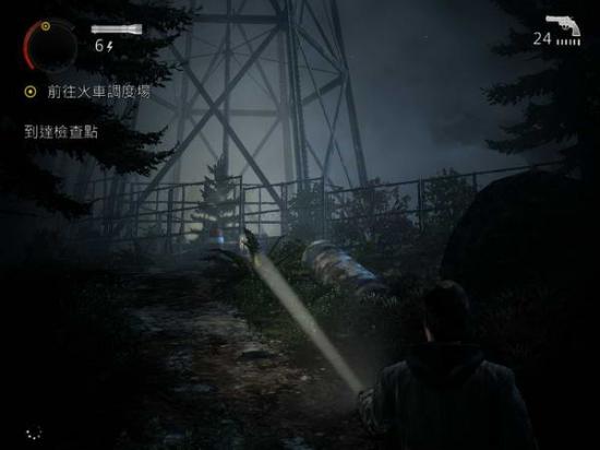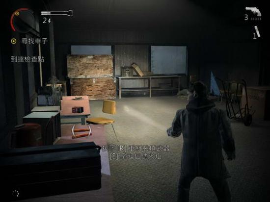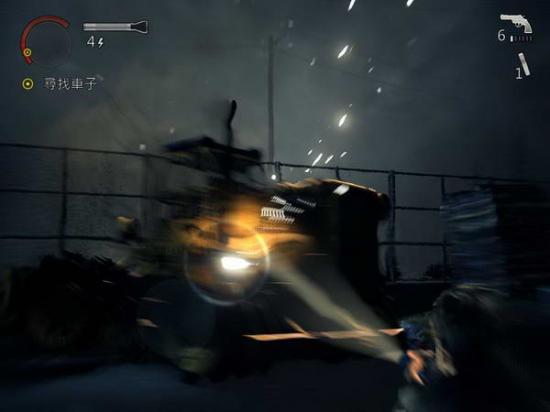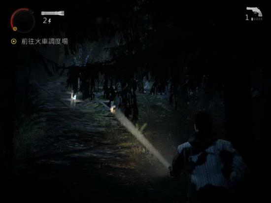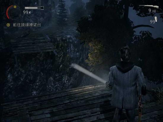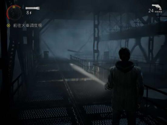 这边小心,开始的时候地面的铁板路会消失飞起来,要绕着走,后面还会有各种障碍物飞起来攻击你,用手电筒照射它们。