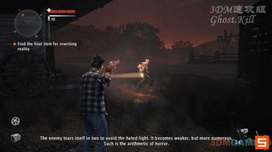 依然是先用灯光破坏到身上的黑暗,再用枪击杀,体型越大的敌人废子弹越多。破坏掉敌人身上的黑暗后不要继续按着右键了,只会白浪费电,直接按左键射击,手电的灯光就是准星。