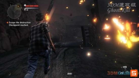 回到车库和女人对话,然后上山到刚才被群怪追杀的地方,分别把找来的三个物品归位,使用之后一颗卫星从天而降砸烂了被黑暗缠绕的塔。欣赏完烟火之后该逃命了,原路下山,绕开着火的地方。