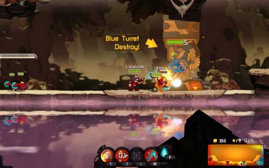 游戏的操控很简单。鼠标左右中三个键为英雄的三个攻击技能。W为跳跃,F为快速传送回本方商店(可快速回血)。而移动则是WSAD模式