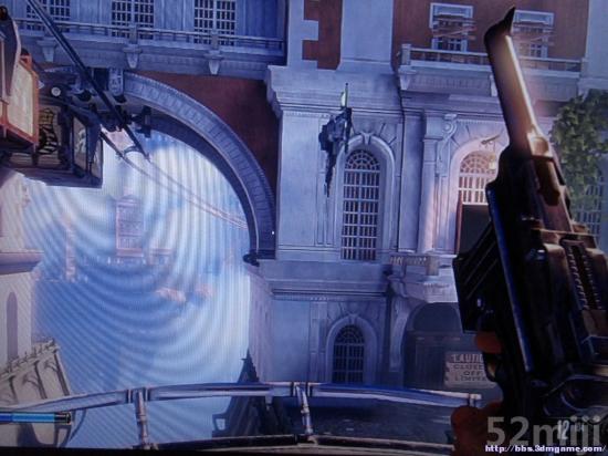 按照“指路系统”的指引来到了一建筑物内,Booker与一股警察发生了械斗,利用“乌鸦啄食”以及“着迷”控制机械人炮台就能轻松过关。从后门出来后,Booker看见空中架起了一道钢铁滑索,利用“搅拌器”按A键即可在滑索上滑行(A键为挑起后滑下、A键对准敌人为空中击杀、B键松手掉落、按下右摇杆锁定目标、左摇杆负责方向以及减速)