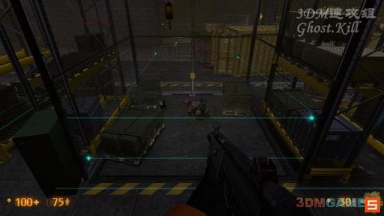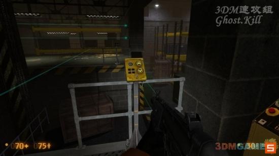 来到右侧的房间上二楼,来到图中按按钮叫电梯,在这之前先把电梯上的箱子打烂,不然会触发镭射。