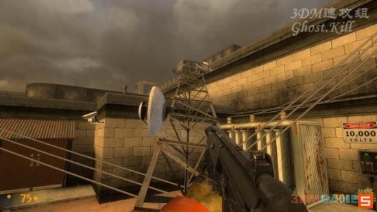 来到电塔这里,先关掉电闸,然后顺着倒塌的电塔上到房顶,从房顶的破口进入房间内。