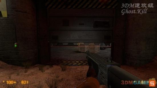 来到图中的铁门外,打开门先不要进去,里边有三个自动机枪,左边两个可以通过打爆油桶解决掉,右边的扔个手雷炸掉。进去搜刮补给,可以捡到火箭筒。