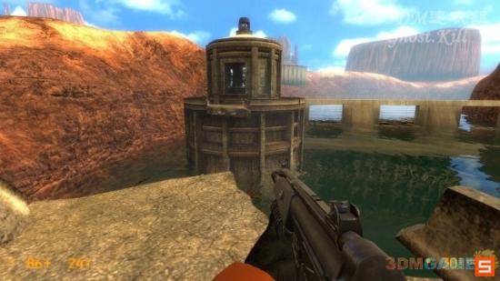 杀光剩下的敌人后去图中的这座建筑,桥塌了就游泳,爬梯子上去打开里边的电闸,然后跳入水中,进入水底的洞里。从洞里一口气被冲到了大坝的下游,沿着河床前进,进入尽头处的管道。