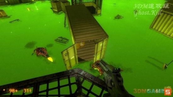 爬到一个有破口的管道中,从管道出来后上二楼,从喷出液体的管子上通过来到图中这个大厅,大厅中也是满是绿色液体,还是从官道上走,来到这个位置跳到下面的集装箱中,穿过集装箱进入电梯。