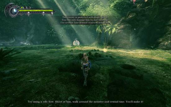 2.值得注意的是在方舟的下面,有个怪是不能被攻击的,但他会秒人用时光回转功能,让它攻击分身,用枪打破后方的物品即可。