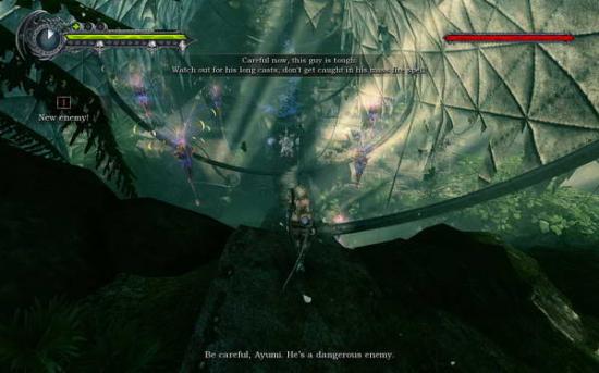 3.桥上的BOSS也没有难度,掌握规律躲开火焰魔法,顺利过关。通过连击能量积累骷髅(左上方),击打的过程中按1 2 3键会有相应的冰、火等魔法攻击锥形范围内的敌人(这招是常用技能要熟练使用)。