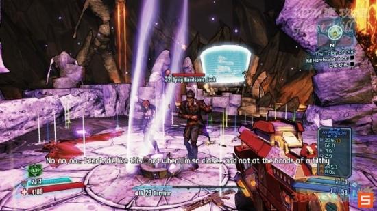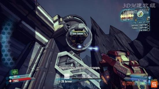 前往Eridium Blight与Claptrap见面,跟着他来到Hero's Pass的大门前,在他开门期间需要保护他。大门上方的防御炮不要管,过一会会自动关闭。机器人的数量比较多,但是弱爆了,很轻松的可以守下来。