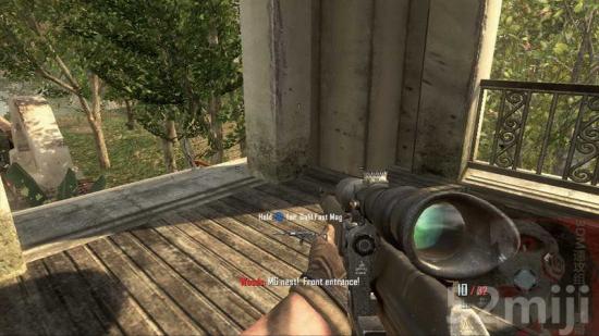 5.来到别墅花园前,敌人火力较猛,建议爬到钟塔顶层,消灭二楼的狙击手和火箭炮手。硬冲就意味着死亡。