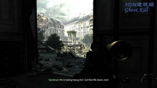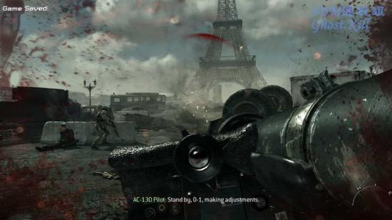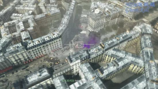 准备从巴黎撤离的时候飞机被击落。视角切换到AC130,1或2切换不同口径的武器掩护地面上的三角洲部队, 优先攻击有紫色烟雾的地方。坦克用105MM口径的可以一下炸掉,用40MM的需要好几炮,机枪不用考虑。