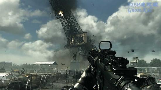 几分钟之后友军增援赶到,前面敌人全部干掉,同时埃菲尔铁塔也倒塌了。左上红色烟雾处的直升机离开。