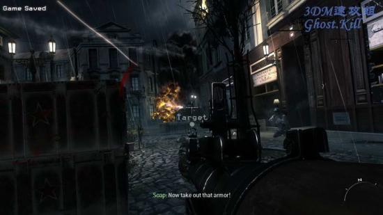 把这里敌人杀光之后跟着大量民兵冲锋,途中被一辆坦装甲车炸倒,跟着肥皂从左边建筑的窗户进入, 绕倒敌人装甲车的后面,尽量绕开敌人走,绕不开的再杀掉。最后进入目标的教堂之后过关。