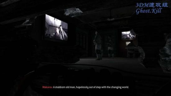 进入炸开的墙壁,爬到上层的控制室外,通过缝隙看到了大屏幕上的马卡洛夫,看来他并不在这里, 往屋里扔颗受累后滑到最下层的厨房逃走。