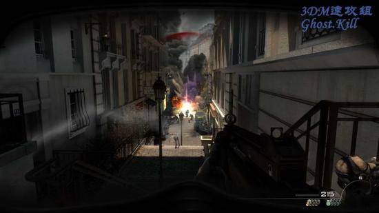 补充下弹药之后肃清整个区域的敌人,数量非常多,建议进入餐厅正对面的房子里打,小心楼梯上的RPG敌人, 全部杀光后来到这个楼梯这里,下边敌人非常多,还有载具,按4拿出烟雾弹扔到敌人最多的地方指示AC130炮击。