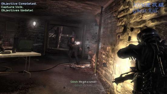 进入下水道后结下了防毒面具,进入一扇门里,突然遭到敌人袭击,杀掉之后被一颗闪光弹闪到,能看清楚的时候目标就在眼前, 干掉杂兵后追上去,爬梯子回到路面上,目标进入汽车里跑了。