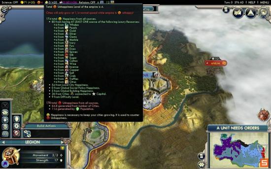 游戏的整体布局没有改变很大,大体遵循原版CIV5的模式。帮助系统由四顾问分别进行提示,当然你也可以再游戏设置里面进行关闭。上边栏则是你的游戏资源详细状况