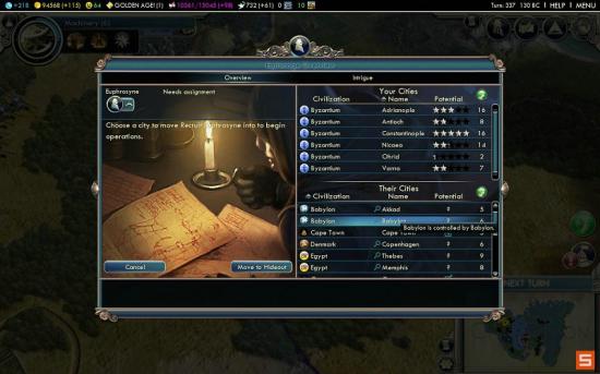 间谍可以指派到本方或者对方的城市,点击MOVE即可选择移动。当然,对方也可能发出派遣间谍的外交选项