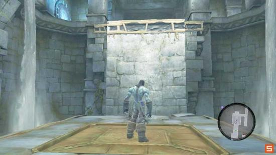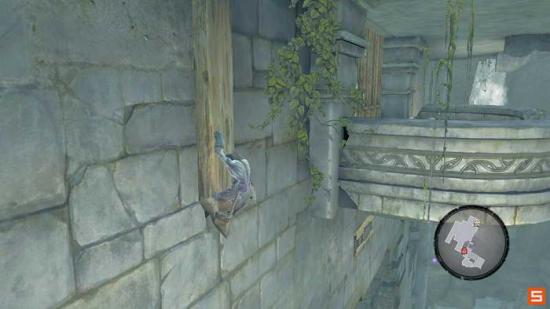 沿着外围的柱体首先来到上层区域。注意下图的平台。玩家需要先站在开关台上,让对面的平台升到最高处,然后迅速从两个平台爬到最上层