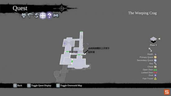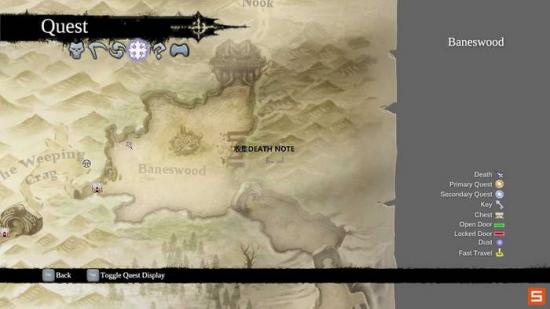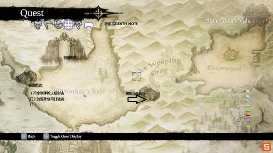由于游戏的设定,玩家可以以如下准则进行主线和支线关系的判断。一般每个主线流程中的支线都会随着主线的进行而顺带发生,从而最后于相应的NPC对话完成,不会出现支线跨越多个主线的情况(除了收集类任务)。这里注意在STUNFATHER'S VALE东北部的拐角可以发现一页DEAD PAGE