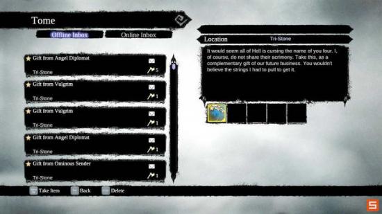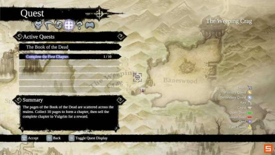 在THE WEEPING CRAIG外围我们可以激活特殊商人,VULGRIM。同该商人对话不仅可以开启他的商店,而且可以激活收集DEAD PAGE的收集品任务