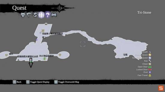 DEATH苏醒之后,发现自己来到了另一个世界TRI-STONE。同长老对话完毕,沿着道路来到城镇核心。由于PC已经集成了大部分的DLC,故玩家可以在地图上龙标识的区域进行互动,捡取额外的奖励装备。当然这些装备的属性也是极其一流的,远高于商店所出售的魔法装备