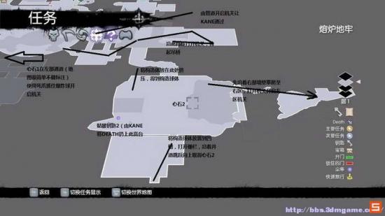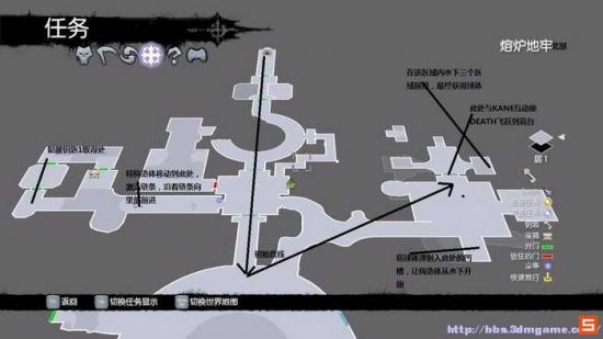 大体的流程如下,标注的很清楚。北部东区的房间需要先从水下潜入,然后穿梭来到球体房间,打开石门让卡恩帮助你顶住,然后弹射球体嵌入顶部的凹槽(按鼠标中键)