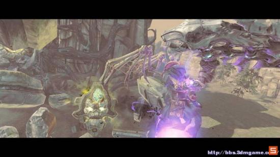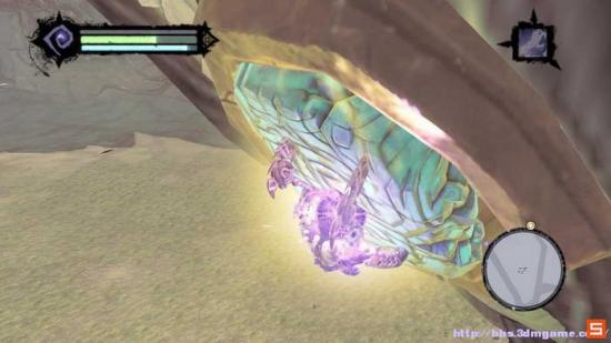 之后快速往守护者的两腿之间冲刺前进,从而当炮弹反过来击倒守护者。之后从守护者的左臂上的阶梯快速爬上,在最高点使用死爪吸附到左边的晶体,然后攻击之