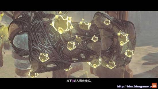 第二阶段则是比较讲究技巧了。此时守护者的左臂会释放巨型跟踪炮弹。而玩家此时所要做的,是在炮弹落地之时,快速瞄准射击炮弹,使其悬空翻滚起来