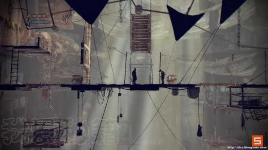 来到下图所示的区域,使用二段跳跳到上面的铁管,沿着铁管跳到对面的楼梯